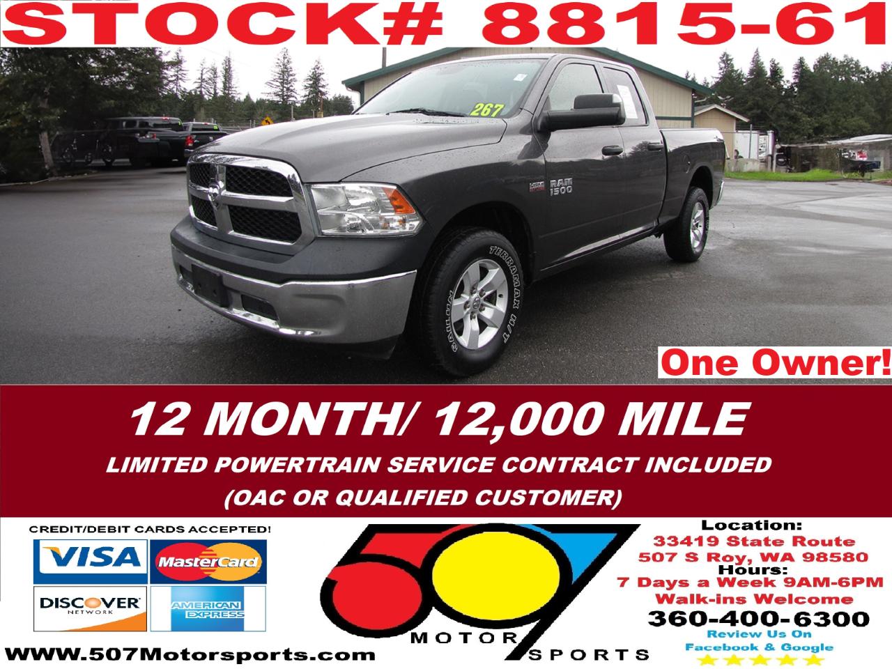 507 MOTORSPORTS makes no express nor implied warranty claims on this vehicle to include availability, condition and equipment as advertised. Any advertised pricing excludes tax, title, license and a negotiable dealer documentary service fee of up to $200 may be added to the sale price or capitalized cost. It is the sole responsibility of consumer to verify the existence of, title status via a history report (available upon request from 507 Motorsports), condition, equipment, pricing and discounts as advertised. This ad supersedes any and all ads before this date. Nothing contained herein is binding on either party. Please direct any and all questions of said policy to ATTN: GSM at 507 MOTORSPORTS, Roy, WA 98580 360-400-6300.