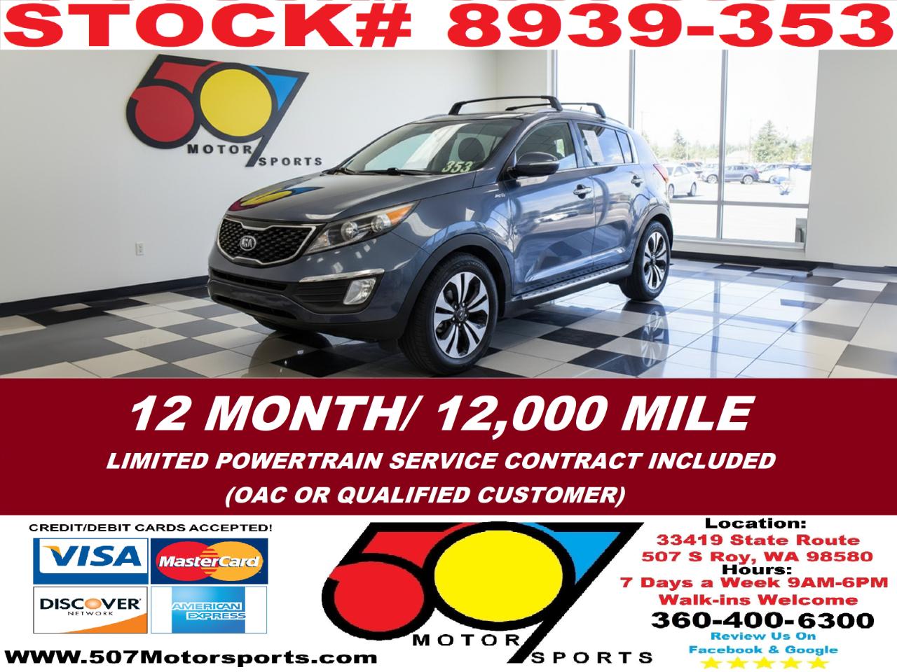507 MOTORSPORTS makes no express nor implied warranty claims on this vehicle to include availability, condition and equipment as advertised. Any advertised pricing excludes tax, title, license and a negotiable dealer documentary service fee of up to $200 may be added to the sale price or capitalized cost. It is the sole responsibility of consumer to verify the existence of, title status via a history report (available upon request from 507 Motorsports), condition, equipment, pricing and discounts as advertised. This ad supersedes any and all ads before this date. Nothing contained herein is binding on either party. Please direct any and all questions of said policy to ATTN: GSM at 507 MOTORSPORTS, Roy, WA 98580 360-400-6300.