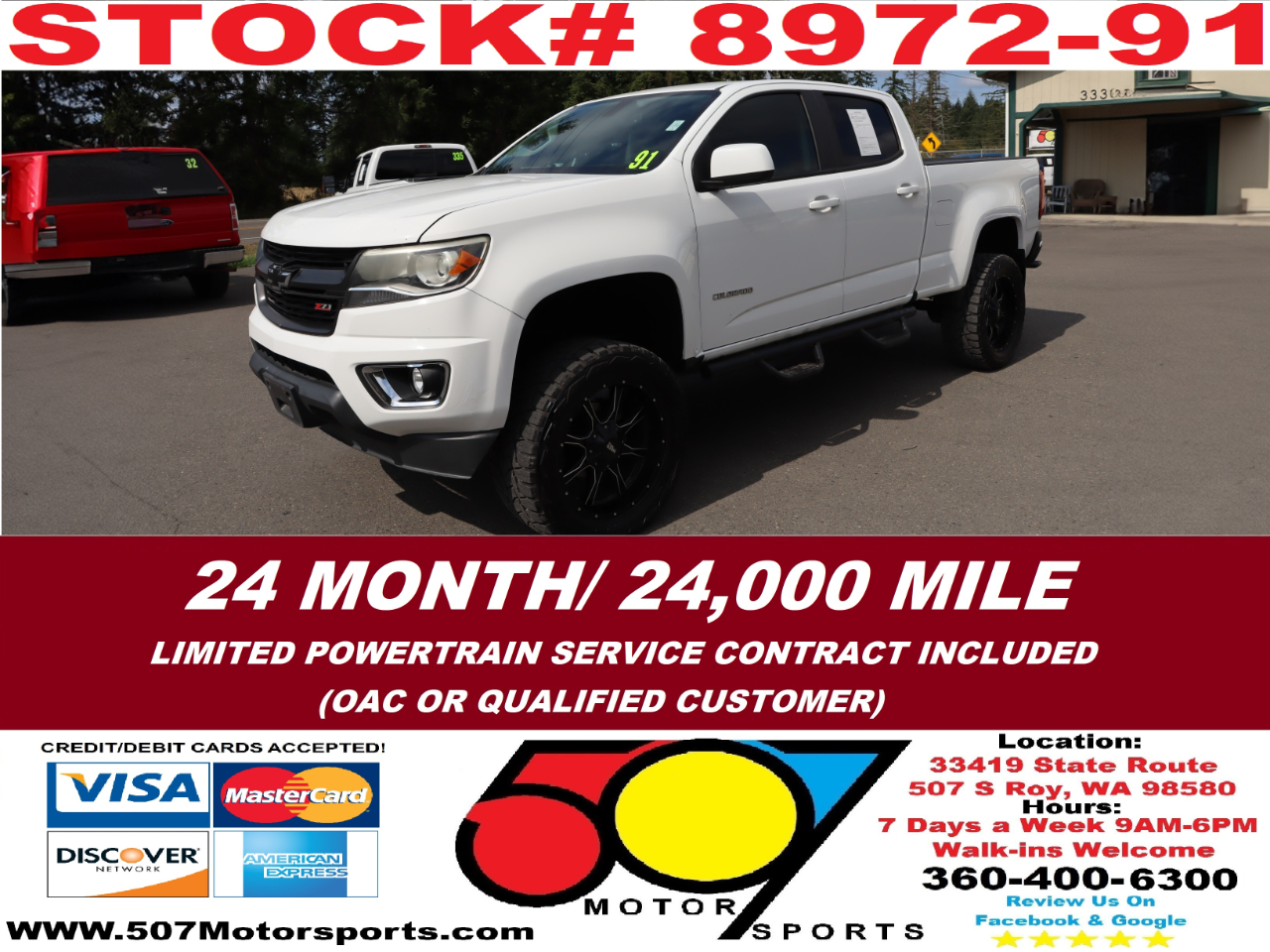 507 MOTORSPORTS makes no express nor implied warranty claims on this vehicle to include availability, condition and equipment as advertised. Any advertised pricing excludes tax, title, license and a negotiable dealer documentary service fee of up to $150 may be added to the sale price or capitalized cost. It is the sole responsibility of consumer to verify the existence of, title status via a history report (available upon request from 507 Motorsports), condition, equipment, pricing and discounts as advertised. This ad supersedes any and all ads before this date. Nothing contained herein is binding on either party. Please direct any and all questions of said policy to ATTN: GSM at 507 MOTORSPORTS, Roy, WA 98580 360-400-6300.