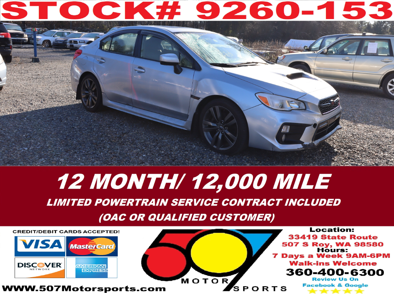 507 MOTORSPORTS makes no express nor implied warranty claims on this vehicle to include availability, condition and equipment as advertised. Any advertised pricing excludes tax, title, license and a negotiable dealer documentary service fee of up to $200 may be added to the sale price or capitalized cost. It is the sole responsibility of consumer to verify the existence of, title status via a history report (available upon request from 507 Motorsports), condition, equipment, pricing and discounts as advertised. This ad supersedes any and all ads before this date. Nothing contained herein is binding on either party. Please direct any and all questions of said policy to ATTN: GSM at 507 MOTORSPORTS, Roy, WA 98580 360-400-6300.