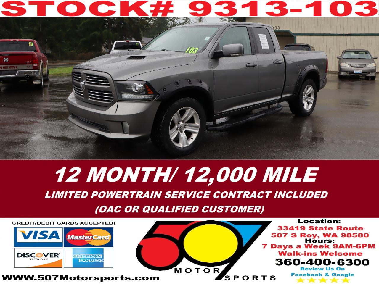 507 MOTORSPORTS makes no express nor implied warranty claims on this vehicle to include availability, condition and equipment as advertised. Any advertised pricing excludes tax, title, license and a negotiable dealer documentary service fee of up to $200 may be added to the sale price or capitalized cost. It is the sole responsibility of consumer to verify the existence of, title status via a history report (available upon request from 507 Motorsports), condition, equipment, pricing and discounts as advertised. This ad supersedes any and all ads before this date. Nothing contained herein is binding on either party. Please direct any and all questions of said policy to ATTN: GSM at 507 MOTORSPORTS, Roy, WA 98580 360-400-6300.