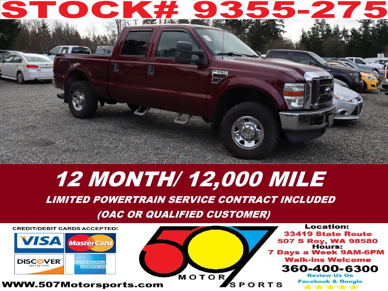 507 MOTORSPORTS makes no express nor implied warranty claims on this vehicle to include availability, condition and equipment as advertised. Any advertised pricing excludes tax, title, license and a negotiable dealer documentary service fee of up to $200 may be added to the sale price or capitalized cost. It is the sole responsibility of consumer to verify the existence of, title status via a history report (available upon request from 507 Motorsports), condition, equipment, pricing and discounts as advertised. This ad supersedes any and all ads before this date. Nothing contained herein is binding on either party. Please direct any and all questions of said policy to ATTN: GSM at 507 MOTORSPORTS, Roy, WA 98580 360-400-6300.