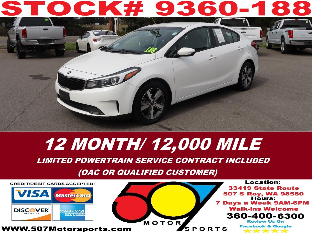 507 MOTORSPORTS makes no express nor implied warranty claims on this vehicle to include availability, condition and equipment as advertised. Any advertised pricing excludes tax, title, license and a negotiable dealer documentary service fee of up to $200 may be added to the sale price or capitalized cost. It is the sole responsibility of consumer to verify the existence of, title status via a history report (available upon request from 507 Motorsports), condition, equipment, pricing and discounts as advertised. This ad supersedes any and all ads before this date. Nothing contained herein is binding on either party. Please direct any and all questions of said policy to ATTN: GSM at 507 MOTORSPORTS, Roy, WA 98580 360-400-6300.